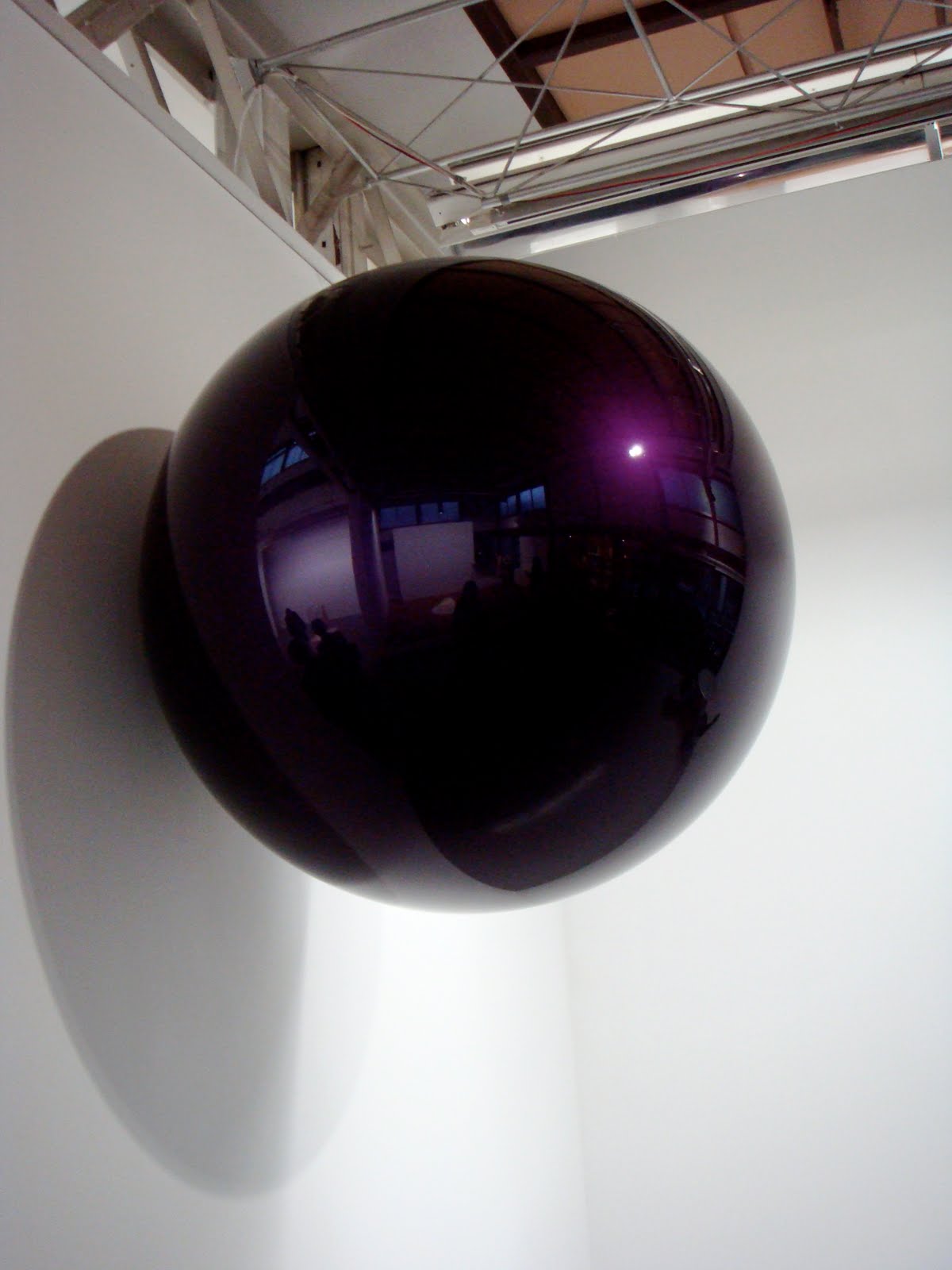 A different Untitled, a fiberglass ball is hung exactly 230″ above the floor. Appreciating it requires a suspension of disbelief on the part of the viewer, so the ball could be sequentially read as rolling, hanging or falling. This sculpture, as well as another one, a granite andlacquer piece made in collaboration with a Japanese urushi lacquer wareartist, presents Kapoor’s trademark vortex shape first tried out in the works from the mid 90s. Only now the vortex is not flush with the gallery wall, so the space behind the smooth lacqueredsurface is revealed as it would be in any sculpture-in-round forcing the viewer to follow the initial experience of being pulled towards the implied gap, with that of discovering spatially finite, graspable quality of the work. The artist’s admission to the specificity of the object (as Donald Judd tagged it), offers an alternative to the subliminal quality of Kapoor’s larger works: still phenomenological, the works in the SCAI show afford more than a mere fragmented reflection of his awe-inspiring large scale sculptures.
