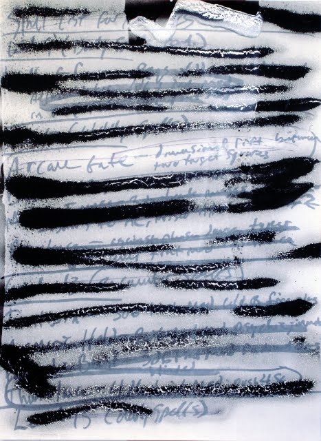 Jeffrey Chiedo’s Motus Fort gallery is now showing the works of Kadar Brock. The key word of the exhibition is “conjuring,” in reference to the conflicting modes of painting and the obscured words and textures that come and go seemingly at the will of the artist-magitian. The two types of works on display are the monochrome mixed media paintings from 2009, like the one above, and the smaller figurative images in color. The monochromes picture the writing obscured by paint smears in what could be described as a gesture of materialization—the artist-magitian realizes the words as he crosses them out. The immateriality of the legible is made into a material sensibility using the physical solidity of paint. Several of the monochromes recall the later works of Anthony Tapies although Brock’s pictorial concerns seem to be less expressive and more phenomenological.